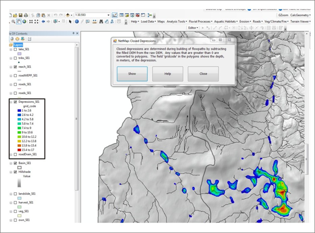 During creation of the analytic stream layer, depressions in the DEM are filled to enable flow routing from one grid cell to another; the accumulation of flow leads to channel networks. The "closed depressions" may be actual features in the landscape or they may be artifacts of the DEM. Larger depressions (such as large lakes, wetlands, bogs, muskeg etc.) are typically included in the NHD "lake" layer, data typically included in a NetMap dataset. Actual closed depressions (not included in the NHD lake layer) could indicate areas such as wetlands or bogs (previously unidentified).