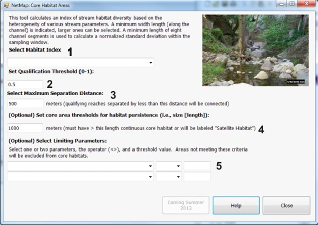 Figure 2. NetMap’s Core Habitat tool allows the user to define concentrations of aquatic habitats based on the principles of habitat quality, size, and persistence. First, a habitat index must be available, such as coho intrinsic potential (1). Next, the habitat quality threshold (2) and the maximum habitat patch separation distance (3) are selected (see Figure 1). Then, a minimum length scale of core habitat areas is defined (4). Finally, the user selects other habitat limiting (or excluding) conditions (5) that were not included in the original habitat index (optional). The mapped results yield habitat core areas. The habitat areas that were excluded in the analysis but that meet the minimum habitat quality threshold (2-4) are classified as “satellite” habitats.