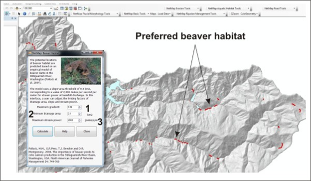The potential locations of beaver habitat is predicted based on an empirical model of beaver dams based on data from the Stilliguamish River basin, Washington (Pollock et al. 2004). The model uses a slope-area threshold of 0.3 km2, corresponding to a value of 2,000 Joules per second per meter for stream power at bankfull discharge. NetMap calculates stream power as: