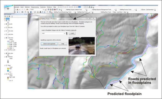 NetMap contains a tool for identifying road segments that are located within predicted floodplains; the Floodplain Mapping Tool needs to be run first. See Figures 1 – 3.