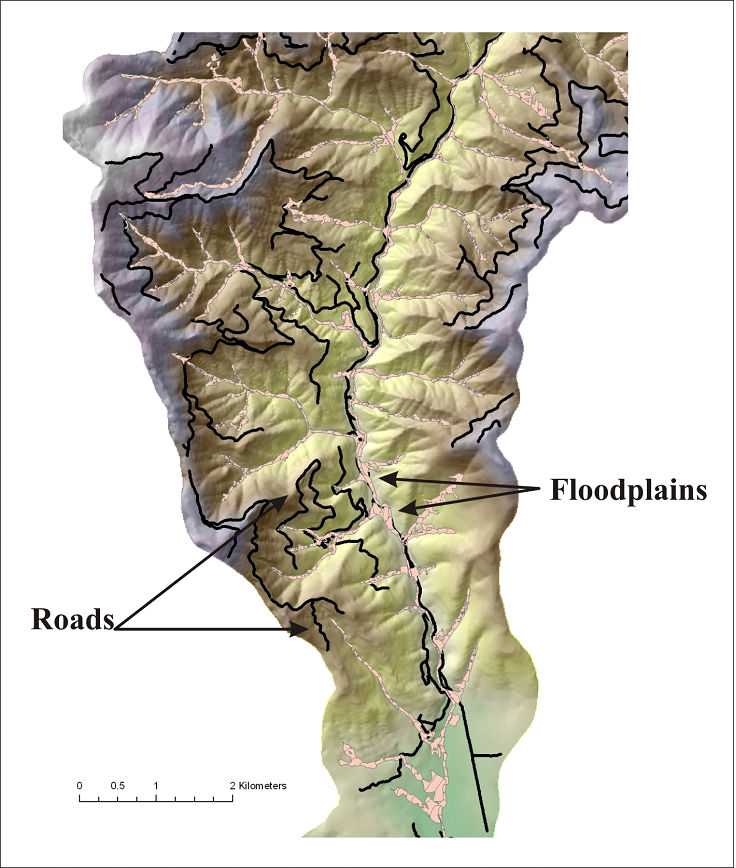 Parameter Description: NetMap’s tool identifies the locations of all roads in floodplains; floodplain extent is predicted by NetMap’s floodplain mapping tool.
