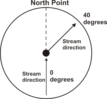 The predominant direction of the stream in the downstream direction; its orientation with respect to true north (0 or 360 degrees).
