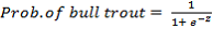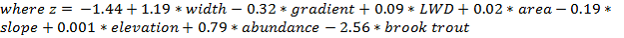 Model Description: The NetMap empirical bull trout model is taken from a modeling study which was completed using data from 112 1st – 4th order streams in the Upper Bitterroot River, Montana (Rich et al., 2003). No sampling occurred: 1) where the stream gradient was greater than 20%; 2) above barriers > 2 m such as falls; 3) where stream width was greater than 7 m due to problems with sampling logistics; 4) where contributing area > 130 km2; 5) at elevations lower than 1340 m or higher than 1945; or 6) at channel gradients higher than 15.6% (Rich et al., 2003). Presence/absence of bull trout was measured using electro-fishing and all sampling was completed within a five-year time period. Predictor variables of from local habitat, watersheds scale characteristics, and biotic factors were tested during model development to generate the final model to address the diversity of habitat needs and size. The model calculates the probability of bull trout presence using a logistic regression with parameters: wetted stream width, reach gradient, large woody debris (LWD), basin area, average channel slope, elevation, main stem abundance of bull trout, and the presence or absence of brook trout (Equation 1,2):