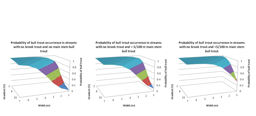 The bull trout model response to varying LWD, main stem abundance of bull trout, and the presence of brook trout as shown in Figure 2; at 60 pieces of wood, all values for bull trout occurrence will be greater than 0.99. Plots of varied channel width and gradient indicate increasing probabilities of bull trout occurrence with increasing width and decreasing gradient (Figure 3). The lowest probabilities of bull trout occurrences ensue when brook trout are present and there are no main stem bull trout. Conversely, highest occurrences of bull trout ensue when there are no brook trout and main stem bull trout populations are greater than five per 100 m of stream. The plots indicate model applicability which should be limited to reaches within the range of sizes and gradients that were sampled by Rich et al. (2003). Streams were sampled up to 6.8 m wide, 15.6 % channel gradient, and 129.7 km2 basin area (Rich et al., 2003).