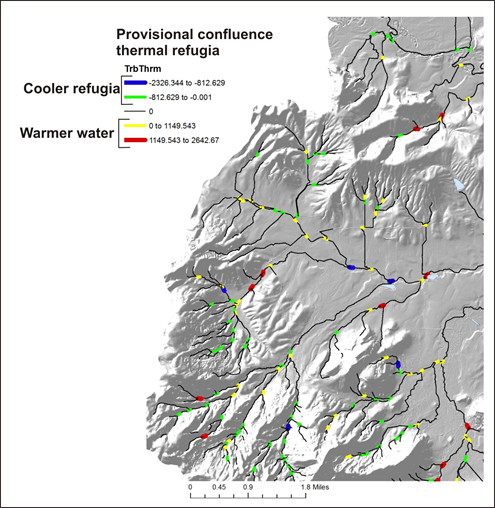 Figure 1. Provisional tributary confluence related thermal refugia; negative numbers represent cooler landscape conditions intersecting warmer landscape condition, in terms of downstream aggregated thermal load.