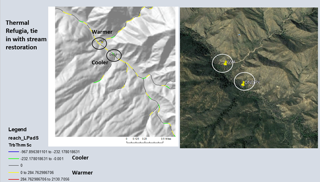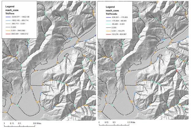 Figure 3. Another example of NetMap's confluence thermal refugia parameter. For best results, use the values scaled by tributary/mainstem drainage area ratio.