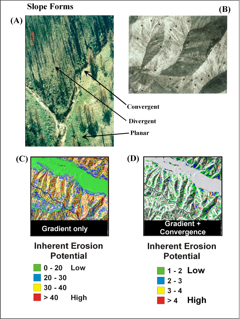 Figure 1. Steep, convergent areas in many landscapes are prone to various forms of erosion including (A) gullying in semi-arid areas, particularly following fires and (B) shallow failures in humid landscapes. Hillslopes can be categorized into (A) convergent, divergent, and planar forms. Slope gradient alone (C) can be used as an approximate indicator of erosion potential since all forms of erosion are strongly governed by slope. A more accurate predictor of erosion potential is slope combined with a measure of topographic convergence to create an intrinsic index of erosion potential (D). NetMap’s GEP index that uses both slope and convergence provides a useful screening of erosion potential across large areas (Figure 2).