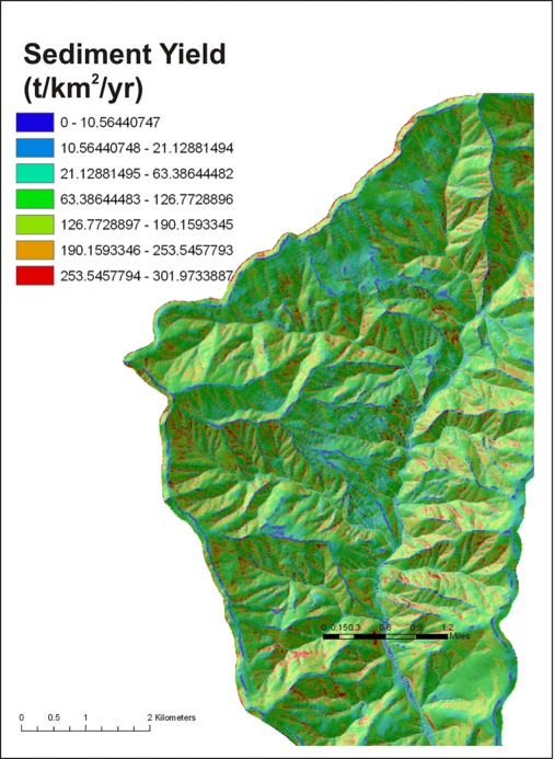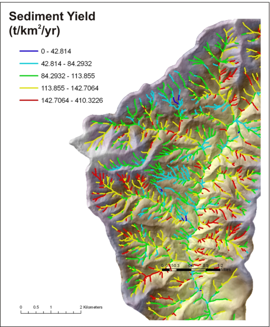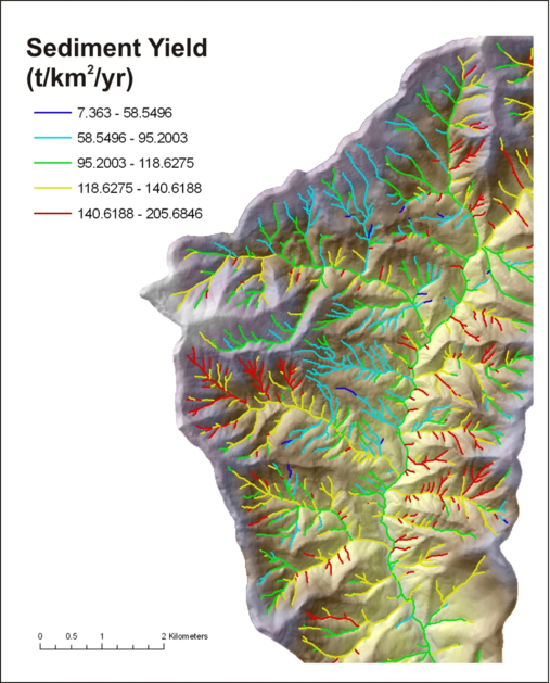 A basin mean annual sediment yield is distributed spatially across the basin (grid cells) based on the range and distribution of GEP values. Higher values of GEP have higher sediment yields and lower values of GEP have lower sediment yield values). All GEP based sediment yields are summed at the scale of individual channel segments, and aggregated downstream (t/km2/yr). The model requires that the downstream most area weighted sediment yield value (in the channel) equal the basin average sediment yield.