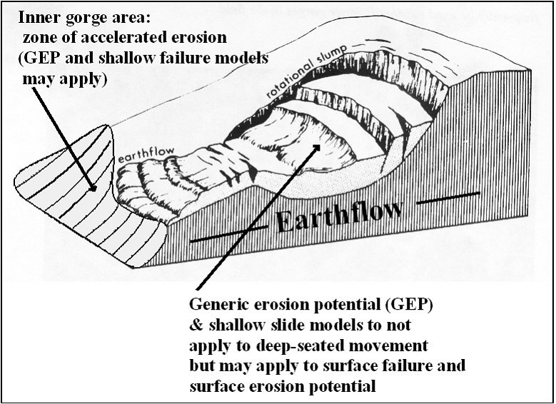 Figure 7. Generic erosion potential and shallow landslide models apply to erosion potential that is driven by hillslope gradient and convergence. GEP may also apply to areas such as inner gorges near streams, to the extent that they are resolvable. GEP-type models do not apply to deeper movement in earthflows and rotational slumps but can apply to surface erosion processes on the slope of deep-seated features, although it can apply to surface forms of erosion on such features.