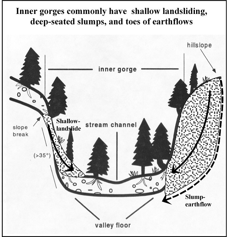 Figure 8. An inner gorge is defined as the lower most portion of a hillslope that is generally steeper than hillslopes above it and may or may not be resolvable on digital elevation models (more likely when using LiDAR, less likely when using 10 m DEMs). Erosion processes within inner gorges can include shallow failures, small rotational slumps, and toes of earthflows. If inner gorges are resolvable, NetMap can account for these processes in the estimation of average annual sediment yields.