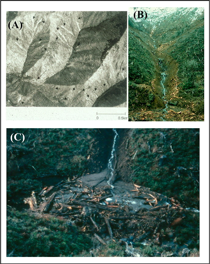Figure 1. Photographs of debris flows in the Pacific Northwest. (A) Post fire debris flows originating from steep and convergent areas (e.g., Figure 3-2) and traveling through headwater streams in western Oregon. (B) A debris flow in a logged area in northwest Washington. (C) Debris flow deposit within a larger, fish bearing stream, Oregon Coast Range.