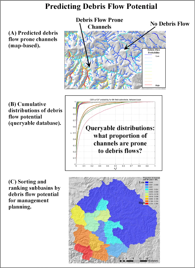 Figure 9. The NetMap model for debris flows can be applied to specific landscapes. The model shown here was developed and empirically calibrated for the Oregon Coast Range but can be used in other landscapes as a relative ranking of debris flow runout risk. (A) Maps are produced indicating the locations of varying potential for debris flows at the individual hillslope scale. (B) Cumulative distribution functions (CDFs) of relative debris flow risk are created at the subbasin scale by another NetMap's Sort & Rank Tool. Such information can be used to sort and rank subbasins according to debris flow risk across landscapes (C). The model should have general applicability to other landscapes prone to debris flows.