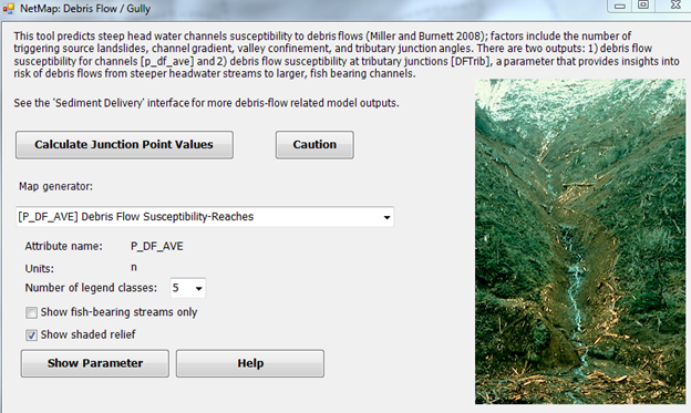 Important Notice: This erosion model is calibrated for the Oregon Coast Range. Thus when used outside of that landscape, the model should be considered as a screening tool that provides a relative ranking of instability potential(e.g., low - high). Although the model employs universal topographic indicators of debris flow initiation and runout potential increased accuracy and resolution can be obtained when debris flow model is calibrated using local data (georeferenced locations of debris flow initiation and runout). A calibration tool is planned for NetMap in later 2014. Also see Warning about using Slope Stability Models.