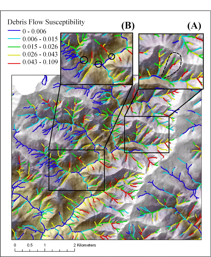 Because of the empirical calibration, the debris flow model is most appropriate for coastal Oregon, although it could be applied to other humid mountain landscapes that are prone to debris flows in steep headwater streams. It is recommended that the probability ranking be changed to a “high likelihood” to a “low likelihood” of occurrence in other landscapes. Other factors need to be considered such as climate and vegetation.