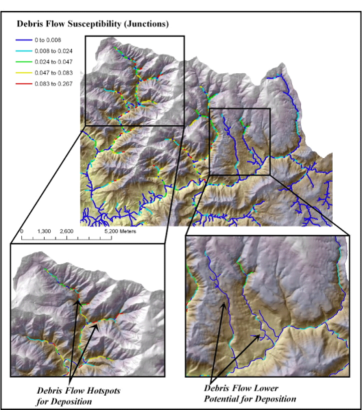 There are a variety of models developed to predict debris flows and their movement and deposition in headwater streams primarily in humid landscapes (Benda and Cundy 1990, Hungr et al. 1984, Fannin and Rollerson 1993, Lancaster et al. 2001). Most of these models require information on network characteristics of headwater systems such as channel gradients and tributary junction angles.