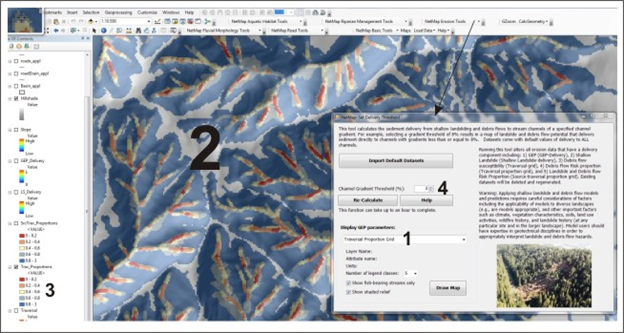 Figure 7. Analyst can select the "traversal proportion grid" (1) to examine the proportion of debris flow runout risk in increments of 20% of the full distribution, such as the highest 20%, the next highest 20% and so on (2, 3). A user can specify a different channel gradient threshold to examine debris flow runout risk, e.g., runout to channels less than 8% (anadromous fish habitat), less than 20% (resident and anadromous fish habitat) etc.
