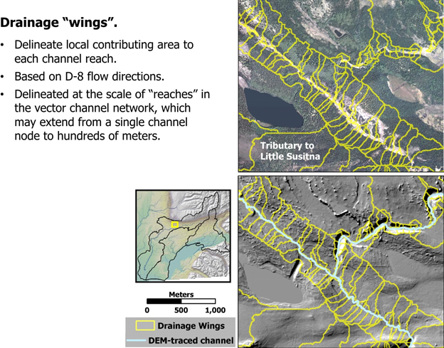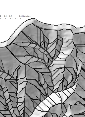 Figure 2. Drainage wings are on the order of 0.1 km2 in area, but variable depending on synthetic stream reaches (typically between 50 and 200 m in length) and topography. The small stream segments and corresponding drainage wings allow for fine scale discretization of the terrestrial landscape to map in detail habitats and land use and habitat interactions.