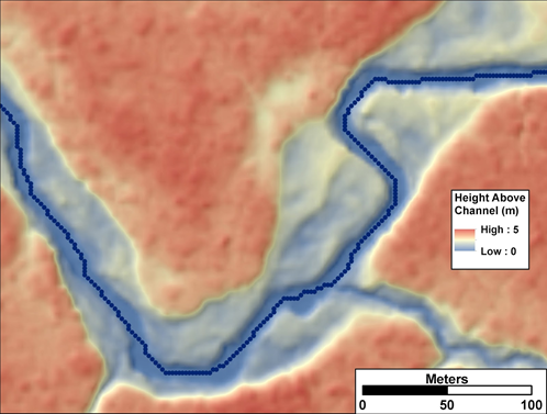 This NetMap tool creates polygons (one for each increment of height above channel) depicting valley surface elevations relative to the channel, using either elevation in meters or increments of bankfull channel depths. The parameter is designed to delineate areas potentially prone to flooding (at varying levels and magnitudes), identify channel floodplain interactions including channel migration areas and avulsion potential, terraces (of varying elevations), alluvial (and debris flow) fans and associated off-channel habitats.