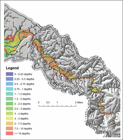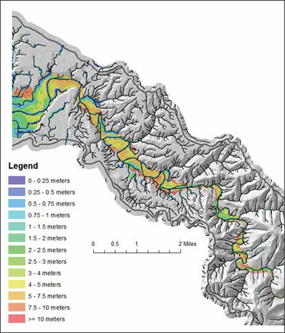 Figure 3. An example of floodplain and terrace mapping in the lower Elk River, Oregon Coast Range; < 1 depths = active channel, 1 - 3 depths = active floodplain, 4 depths = occassionally flooded, and > 4 depths = terraces.