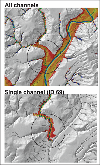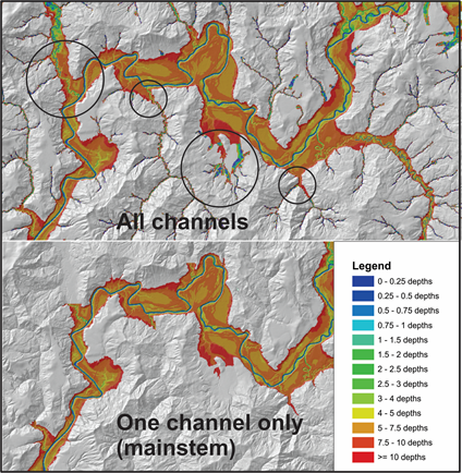 Figure 8. This shows the difference between viewing all channel floodplains (upper) compared to viewing only the smaller channel floodplain. Note the difference at the confluence. Using all channels, the larger channel floodplain can obscure the smaller channel floodplain.