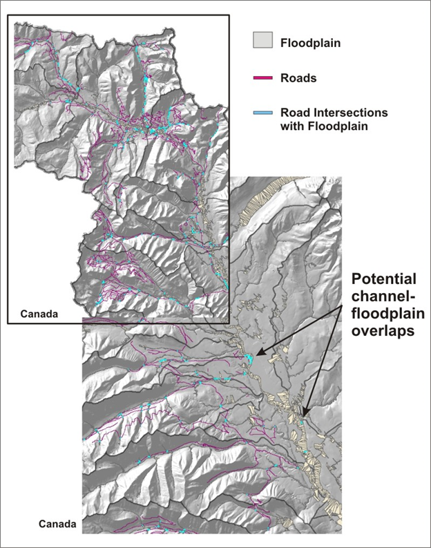 Polygon maps of floodplains are also used in NetMap to identify roads that intersect floodplains (Figure 5).