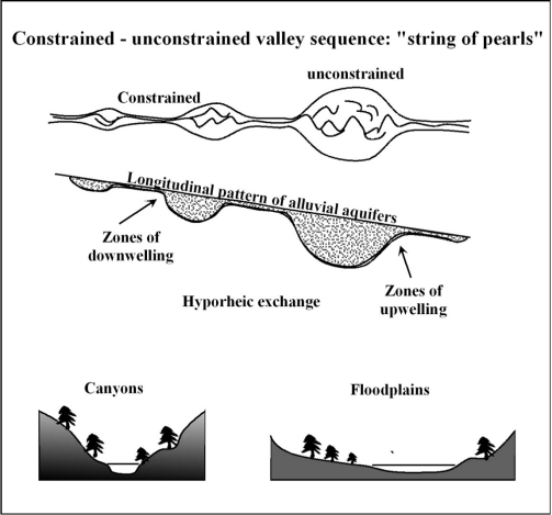 Geologic controls and major slope movements can create variations in floodplain (and valley width) and shape. Constrained (narrow) valleys typically lack sediment storage while unconstrained (wide) valley segments act as storage reservoirs of alluvial sediment, often creating wide, more complex floodplains within the fluvial landscape (Grant and Swanson, 1995, McDowell, 2001). At the upstream transition from unconstrained to constrained valley segments, a bottleneck in the transfer of sediment can occur, often enhanced by logjams. Increased sediment storage at the transition promotes heightened connectivity between channels and adjacent valley floors. The transition from unconstrained to constrained segments also enhances hyporheic downwelling (Figure 11). At the downstream transition from constrained to unconstrained valley segments, increased sediment deposition, flow divergence, and hyporheic upwelling can occur (Edwards, 1998). Thus, there is typically greater channel-valley connectivity and hence larger fluvial landscapes immediately above and below valley constrictions, with increased occurrence of floodplains, side channels, and riverine wetlands (Baxter, 2001). Alternating constrained and unconstrained river segments promote patchy heterogeneity in fluvial processes and riparian environments, a pattern often referred to as a “string of pearls” (Standford and Ward, 1988) (Figure 12).