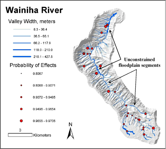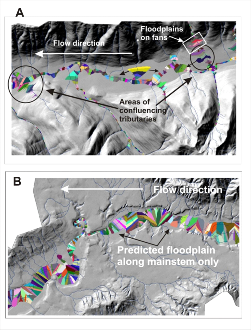 Locations of floodplains and their association with tributary confluences (see ‘Confluence Environments’ in NetMap’s Fluvial Morphology Module’) can be used to identify provisional biological hotspots (Figure 13). To view how NetMap’s floodplain and tributary confluence tools can be used in reconstructing fluvial landscapes for planning restoration, see: http://www.hydrol-earth-syst-sci.net/15/2995/2011/