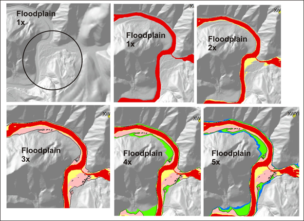 Figure 7. Floodplain at one multiple of bankfull depth (1x) generally identifies the active channel. Floodplain at two multiple of bankfull depth (2x) generally maps the lowest, most active floodplain, commonly thought to be inundated by the two-year flood (Dunne and Leopold 1978, Rosgen 1996). 3x floodplain is likely inundated by low frequency, high magnitude floods. 4x floodplain may represent an alluvial terrace or toeslopes of hillsides. Ditto for 5x and beyond.