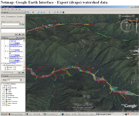 This NetMap tool allows a user to “fly” from any point in NetMap’s Digital Hydroscapes in ArcMap to Google Earth. The projection has to be consistent with Google Earth although NetMap databases should be in the correct projection for export. Data are exported using the current color-coded legend and it is shown in Google’s “Places” window on the left side.