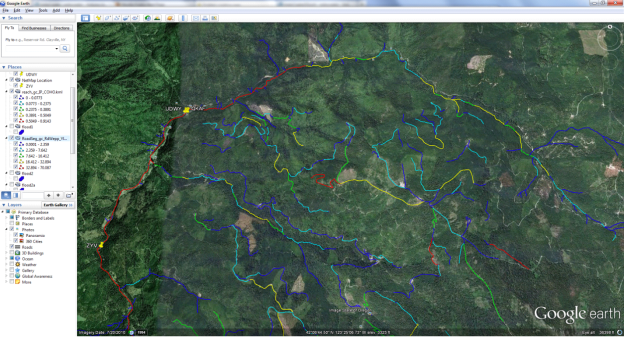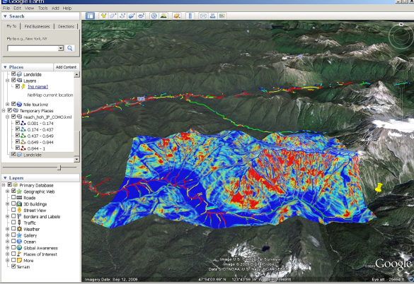 Figure 2. NetMap’s Google Earth tool is used to juxtapose steelhead habitat (reach, channel colored segments) in the Hoh River basin in western Washington with predicted shallow landslide potential (grid). This allows analysts to examine, visually, spatial overlaps between areas of high erosion potential and important and sensitive fish habitats.