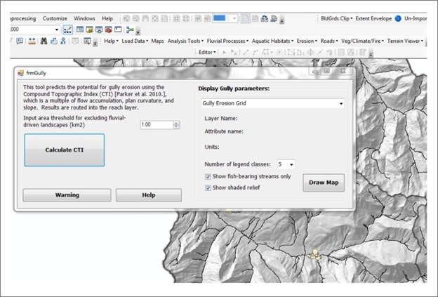 Figure 1. The gully tool interface. A user inputs an area threshold and then proceeds to calculate gully erosion potential.