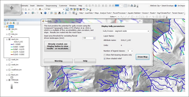 A user first provides an area threshold to limit the gully erosion prediction into the fluvial network (1 km2 is the default). Running the two creates three outputs: 1) hillslope prediction (grid), which can include channel cells, 2) gully potential reported to reaches and 3) gully in reaches (gully values summed via drainage wings), summed (aggregated) downstream.