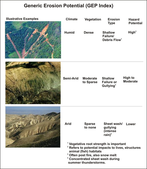 Generic Erosion Potential (GEP), based on slope steepness and convergence, represents the potential for at least three different types of erosion and hazards (see Figure below).