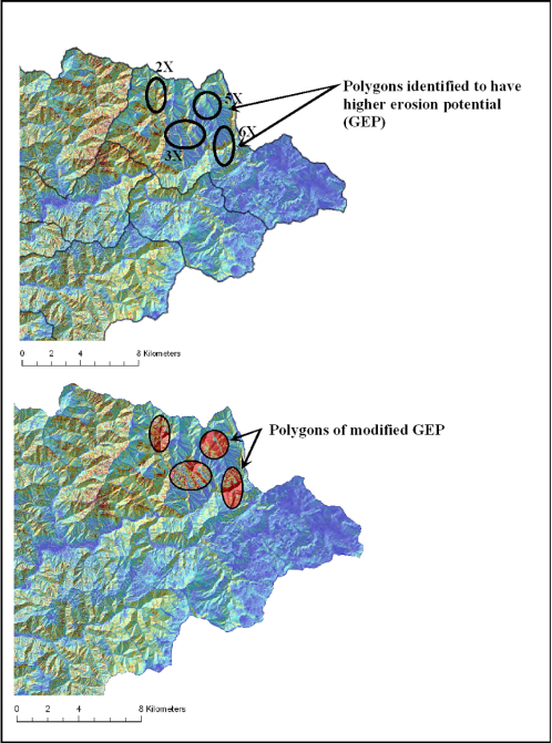 Figure 8. Based on site-specific information on erosion potential, Generic Erosion Potential values (GEP) can be modified by importing a polygon layer with assigned factors of increase or decrease in the attribute table. (TOP) Basic GEP values with polygons identified along with their factors of increase are shown. (Bottom) By using the modify GEP tool in NetMap, regular GEP values are modified (increased) in each of the polygons according to the factors of increase shown above.