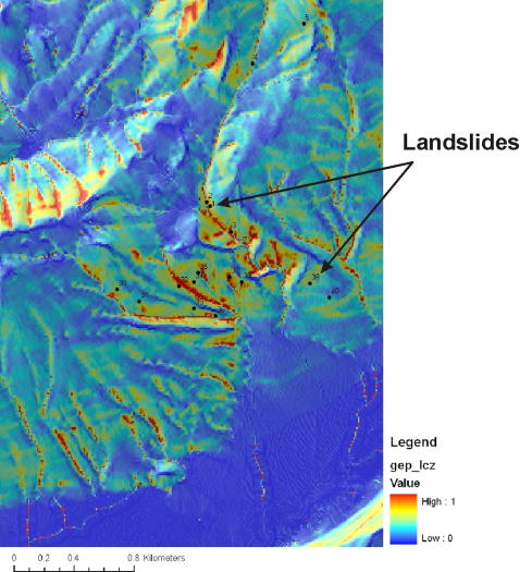 Important Notice: This erosion model is not calibrated to any particular area. Although the model employs universal topographic indicators of shallow landslide potential (and also gully potential), increased accuracy and resolution can be obtained when the GEP index is calibrated using local data (georeferenced locations of landslides or gullies). TerrainWorks has developed a landslide calibration tool, contact us for additional details . Also see Warning about using Slope Stability Models.