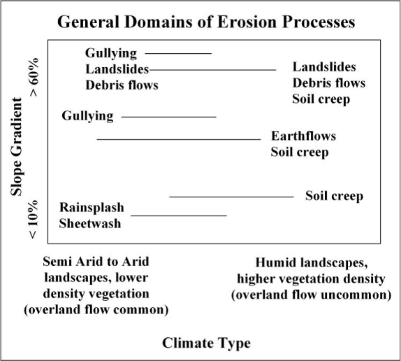 Figure 11. Hillslope gradients strongly influence the type of erosion that characterizes semi-arid to humid landscapes (adapted from Figure 15-1 of Dunne and Leopold [1978]).