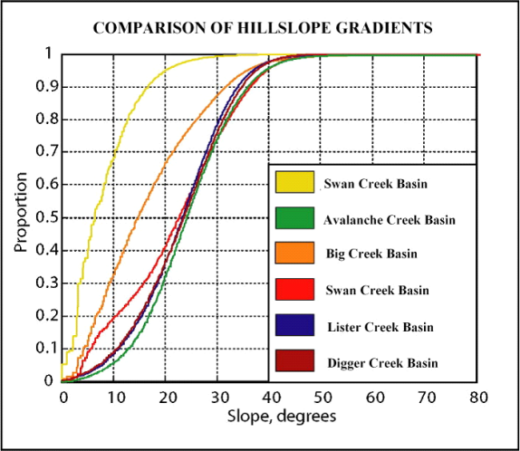 Slope gradient can be uses as a measure of erosion potential, although NetMap’s GEP, shallow failure, debris flow and surface erosion predictions provide additional information. Using slope gradient or GEP alone, for example, cumulative distributions can be created across entire watersheds (using NetMap’s CDF tool) to rank the erosion potential across different basins (Figure 12). The CDF identifies the proportion of watershed area susceptible to certain types of erosion (an interpretation conditioned by fire and precipitation regimes, etc.). For example, the proportion of the slope gradient CDF greater than 35o ranges from 0% to 15% across the example basins shown in Figure 10. Heterogeneity of hillslope gradients reflected in a CDF (the spread of the distribution) also can reflect the diversity of erosion processes and hence the diversity of erosion rates within a basin. The CDF is used within a queryable database from which watersheds can be ranked with respect to inherent erosion potential.
