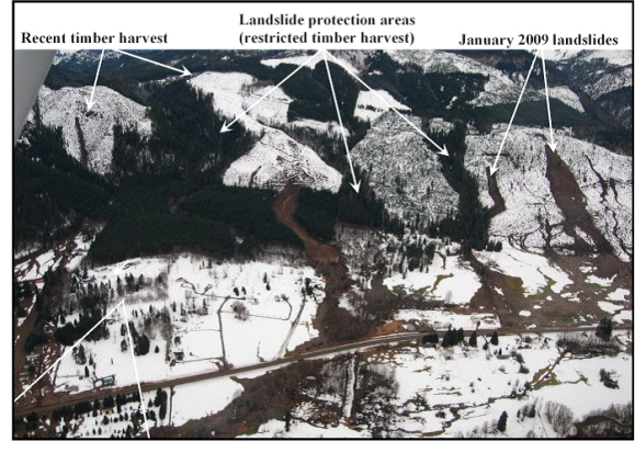 Figure 13. Photo shows numerous landslides following a major winter storm in southwest Washington. Also shown are timber harvest areas and zones of restricted harvest (forested) located along landslide-prone stream valleys associated with high hazard landforms. Courtesy Washington Department of Natural Resources.