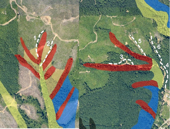 Figure 14. Hand drawn mass wasting map units are overlaid on digital imagery. This figure reveals the accuracies and inaccuracies of the hand-drawn map units with respect to the targeted landforms (steep (>72%) and convergent landforms in red and steep inner gorges in yellow). In many areas the hand-drawn slope stability maps (on paper 1:24,000 topographic maps) match well with the topography. However, in other areas the map units are not well aligned with the actual topography (the white dashed lines 1, 2, 3 and 4 indicate the miss-mapped locations of the target landforms). Moreover, in some areas the hand-drawn map units miss the landform completely (white dashed line 5 and 6). This limitation was acknowledged during the original (1996) assessment leading to a field implementation recommendation to use the map unit physical descriptions as the deciding factor in laying out harvest units rather than map itself.