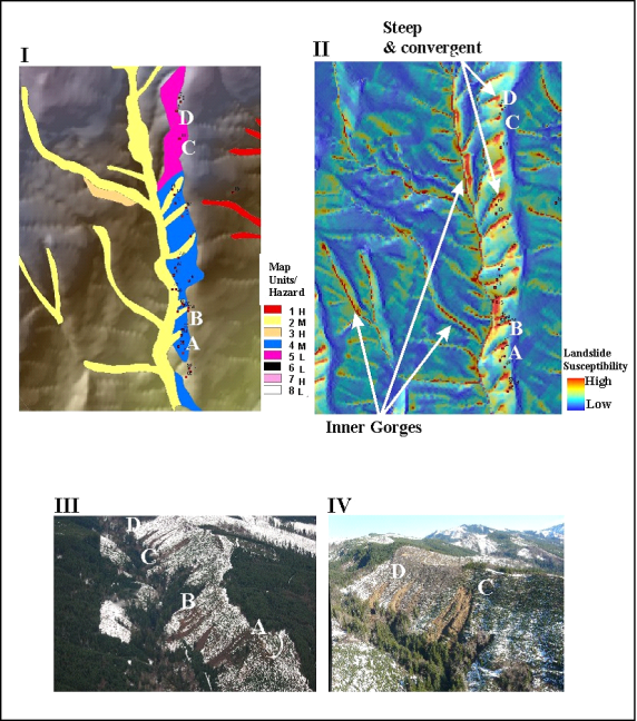 (II) Using NetMap, GEP erosion potential of the same area. (III, IV) Aerial photos of 2009 landslide sites. Slides A – D are shown on both map products as they appear in the field.