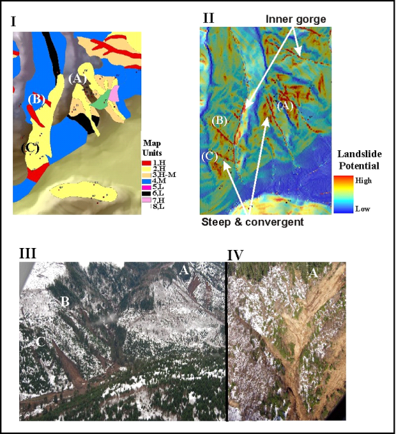 Figure 16. (I) Hand-drawn slope stability map. (II) NetMap’s GEP model. (III, IV) Aerial photos of landslide sites. Slides A – C are shown on both map products and as they appear in the field. In this area, there is generally good agreement between the old and new technologies (I and II), although the computer-based tools (II using 10-m DEMs) provide greater detail.