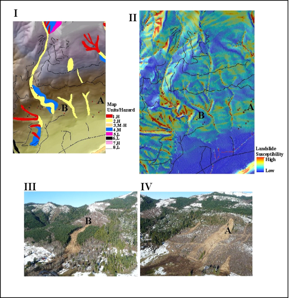 Figure 17. (I) Hand-drawn slope stability map. This map classified the sites of the large slides (A, B) as ‘low’ hazard because of low landslide rates (e.g., historically [1939-2006] no landslide occurrence) and the predicted low likelihood of direct delivery of sediment to fish-bearing streams. (II) NetMap’s GEP tool. This figure indicates some instability potential, although not nearly as great compared to steep and convergent areas (e.g., Figures 14 and 15). (III, IV) Aerial photos of landslide sites A and B.