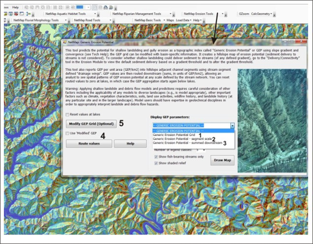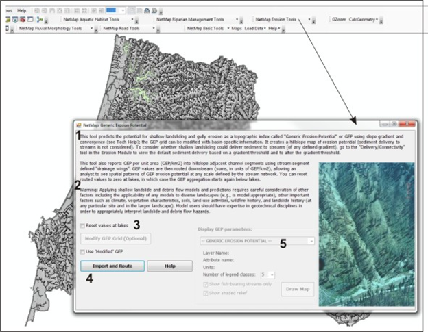 Figure 1. NetMap's Generic Erosion Potential tool (GEP) uses an index of hillslope gradient and convergence (1) and is appropriate in any landscape prone to shallow landslides and gully erosion. Use of the tool is best done by analysts with some background in slope stability (2). When first running this tool in a watershed, a user decides to "reset values at lakes" (3) in the channel based attribute of the GEP index (e.g., GEP values summarized to reaches at the scale of drainage wings and then routed downstream) or to not reset at lakes. For example, if GEP is considered an index of erosion and sediment yield potential (rather than just an index of slope stability hazards), then sediment routed downstream will become intercepted by lakes, and thus a user might want to use the "reset values at lakes" option. Then a user imports the data (4) and the tool automatically routes the data to individual stream segments (a fish eye view of erosion potential) and then downstream.
