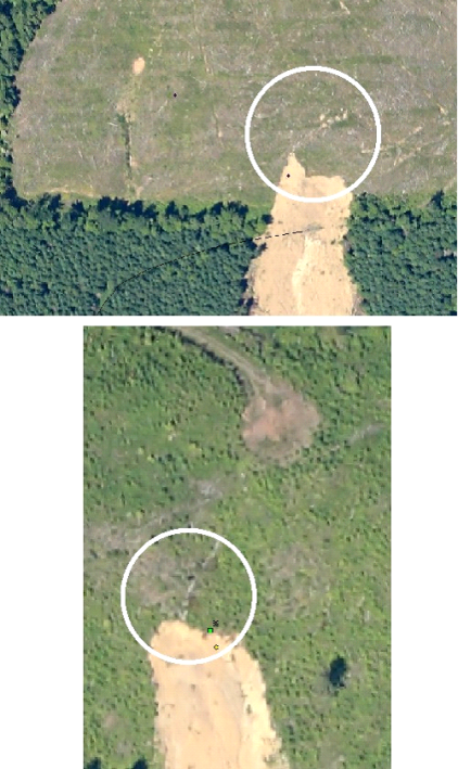 Figure 18. The largest landslides appear to be in association with skid roads and perhaps more regularly used logging roads. The small black x and green square correspond to landslide inventory points.