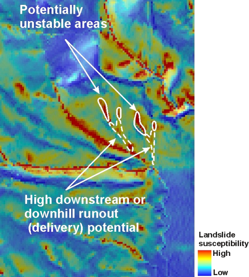 To calculate the potential for sediment delivery (for GEP type land, that is, where hillslope steepness and convergence promote erosion, including shallow failure), the model traces the down slope flow path until it intersects a stream. The calculated probability for sediment to be transferred to each downslope cell decreases monotonically as a function of gradient and topographic confinement (based on field data from the Oregon Coast Range, see Miller and Burnett 2007a). [note: sediment delivery applies to mass wasting sediment delivery, say by debris flow or landslide. It also does not apply to surface erosion processes.] The probability that sediment will reach a stream is assigned to the source cell. This is repeated for all hillslope pixels. The resulting raster file provides a map of potential for sediment delivery (to a stream) for every pixel cell in a basin. The probability of sediment delivery is then multiplied to the GEP value, thus providing a prediction of sediment delivery from GEP ranked hillslopes (Figure 6).