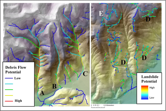 Figure 18. Examples of computer-based tools showing debris flow susceptibility in the left panel (based on Miller and Burnett 2007b) and road-related landslide potential on the right panel using NetMap. Computer based tools utilizing digital data provide increased spatial detail about landslide potential, their downstream impacts, and the potential impacts of logging activities on landslide and surface erosion potential. The examples show debris fans at the base of small, steep tributaries can be hotspots for debris flow impacts to roads and structures. Sites A, B, and C reveal areas of varying susceptibility by debris flows. Sites D and E indicate areas were road drainage diversion or road fills may trigger landslides. Such tools could be used to create prioritization strategies for road maintenance and abandonment.