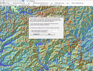 Figure 7. Analysts can modify the GEP or GEP (delivered) parameters (grids) using specified factors of increase or decrease, either in shape files or using a fixed value; a polygon shape file is required. For example, certain types of land use (timber harvest) may increase GEP values and certain types of lithologies could decrease GEP values. The tool can be applied to the GEP grid or the GEP delivered grid (3, 4). See Figure 10. The modified GEP index can then be converted to sediment yield, similarly to the standard GEP conversion to sediment yield.