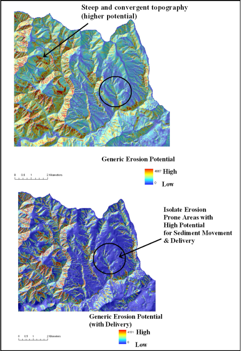Figure 7. (Top) The NetMap parameter of Generic Erosion Potential (GEP) identifies steep and convergent areas providing a relativistic ranking of erosion potential targeting shallow landslides, debris flows and surface erosion and gullying. (Bottom) GEP is adjusted according to its potential for sediment delivery to streams; this applies only to mass wasting processes and it does not apply to surface erosion sediment delivery.
