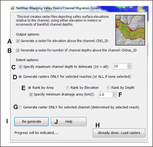 Figure 1. (A) Select to generate valley floor elevations (raster grid) in terms of height above channel in meters. (B) Select to generate valley floor elevations in terms of number of bankfull depths. The default is that both will be generated simultaneously. (C) Specify the maximum number of channel depths to delineate the floodplains, range from one to ten; this option is most relevant when mapping wide valley floors, with the lateral extent of the delineated floodplain increasing with number of bankfull depths. It will also affect the extent of the absolute elevation rasters. (D) Select the reaches to analyze, otherwise all channel segments (and associated valley floors) will be evaluated; running full watersheds may only take a few minutes. (E) For valley floor DEM cells that lie close to two channels (at confluences), it is imporant to consider which channel a valley floor DEM cell will be associated with; this is referred to as "rank by area, "rank by elevation" or "rank by depth", see paragraph above for the description of these options. (F) A minimum channel drainage area for mapping can be selected, set as a default of 1 km2. (G) The analysis can be conducted for individual channels, indicated by selecting an individual reach within a channel (channel is defined as an entire tributary that extends furthest upstream and downstream until it intersects a channel of larger drainage area. (H) A button to load already completed analyses (rasters). (I) Recalculate. (J) Technical Help.