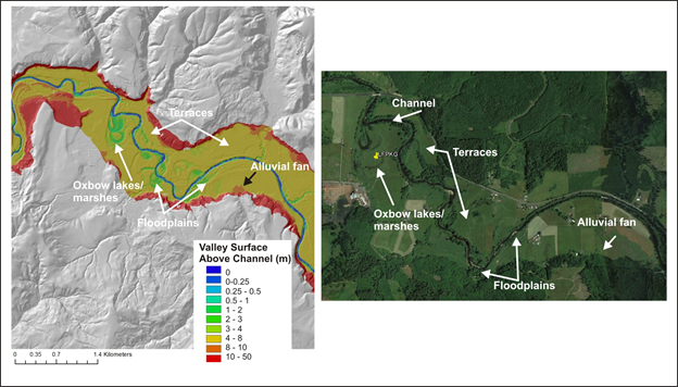 Figure 6. NetMap's valley floor mapping tool, particularly in concert with LiDAR DEMs, can be used to identify oxbow lakes, cutoff meanders, side channels, floodplains, marshes and alluvial fans.